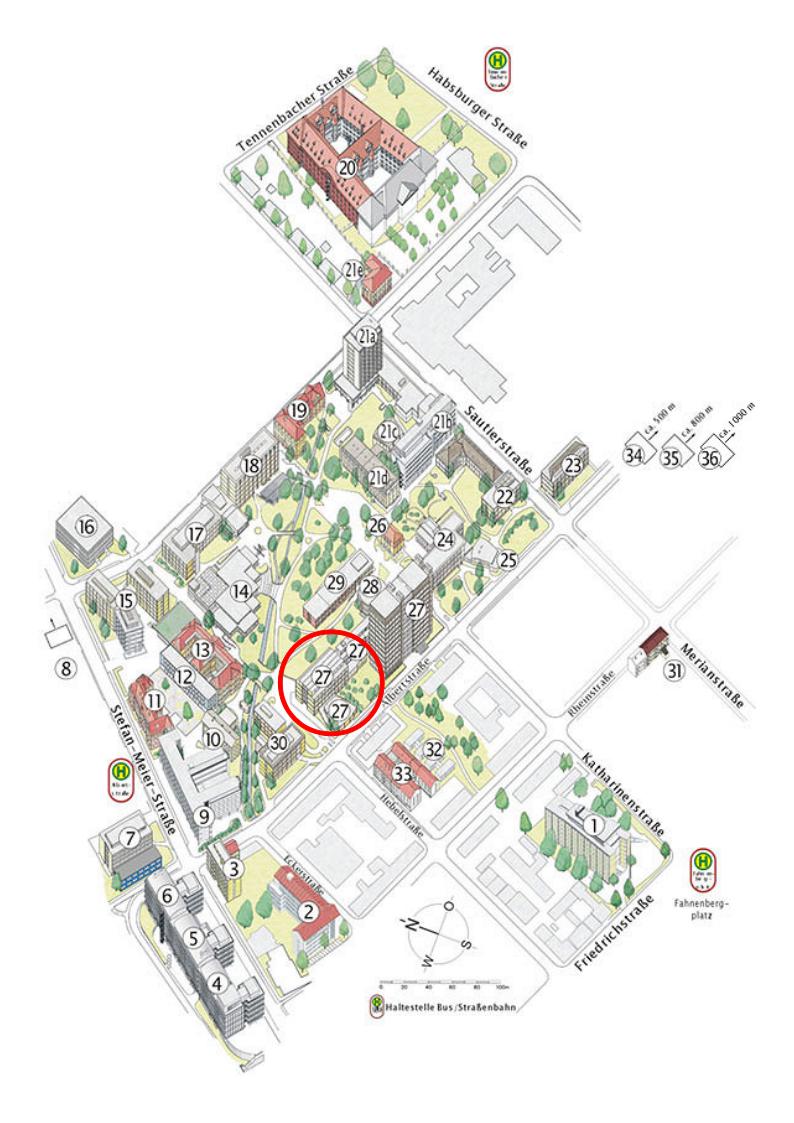 Die Universität Freiburg ist auf mehrere Standorte im Stadtgebiet von Freiburg verteilt. Das Institutsviertel befindet sich nördlich der Innenstadt nur ca. 10 - 15 Gehminuten vom Bahnhof oder zum Stadtzentrum (siehe gelb markierte Gebäude auf dem Lageplan der Uni)
